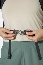 The hipbelt is designed to securely fasten around your hips. A common mistake is to put the weight of the backpack on your shoulders and use the hip strap for stabilisation. In fact, it works the other way round. The hips need to take your weight and the shoulder straps are for stabilisation.