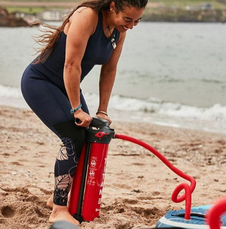 The Dual Cylinder system, combined with the Hi Flo handle means you are in complete control of the energy used to inflate your board. It puts the volume into your board faster and reduces the effort required to reach a higher pressure.