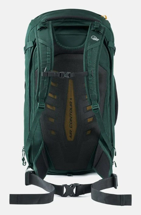 The Lowe Alpine Escape Tour 55+15 is the complete adventure travel backpacking system. With a secure rear-access 55-litre backpack and a detachable 15-litre day pack, it allows you to reach a destination, drop the baggage and explore without unnecessary weight or bulk. In addition to the adjustable Air Contour+ carry system, the main pack features robust top and side handles, an integrated travel cover and a quick-grab top pocket with secure passport slot for easy organisation in transit. The style-matched day pack also features a rapid-access top pocket, plus a water bottle holder, a 14-inch laptop sleeve and an additional passport slot. It attaches to the main pack with tough metal hooks rather than zips for extra strength, cleanliness and comfort. When travelling with both packs in tandem, the day pack can also be clipped to the harness and worn on the front for improved security and load distribution.