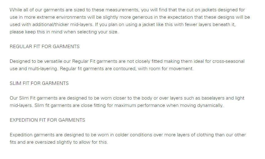 While all our garments are sized to these measurements, you will find that the cut on jackets designed for use in more extreme environments will be slightly more generous in the expectation that these designs will be used with additional/thicker midlayers. If you plan on using a jacket like this with fewer layers beneath it, please keep this in mind when selecting your size.