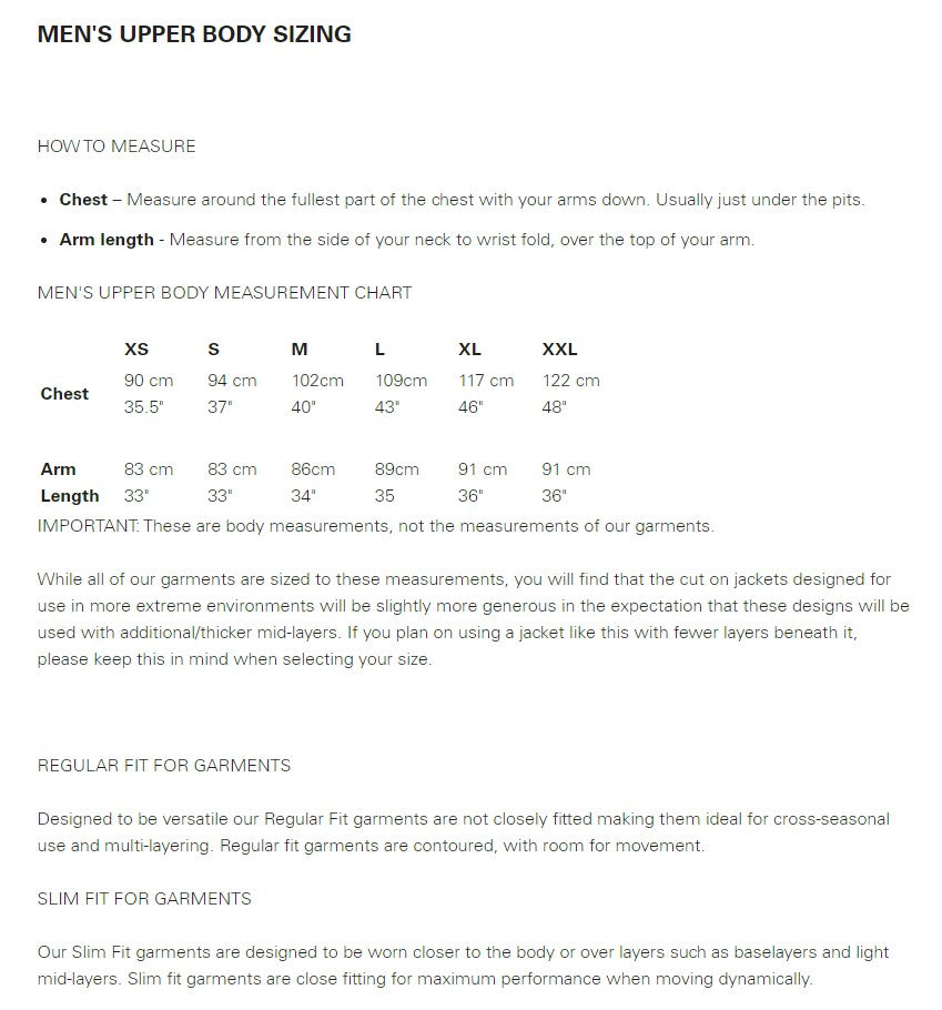 While all our garments are sized to these measurements, you will find that the cut on jackets designed for use in more extreme environments will be slightly more generous in the expectation that these designs will be used with additional/thicker midlayers. If you plan on using a jacket like this with fewer layers beneath it, please keep this in mind when selecting your size.