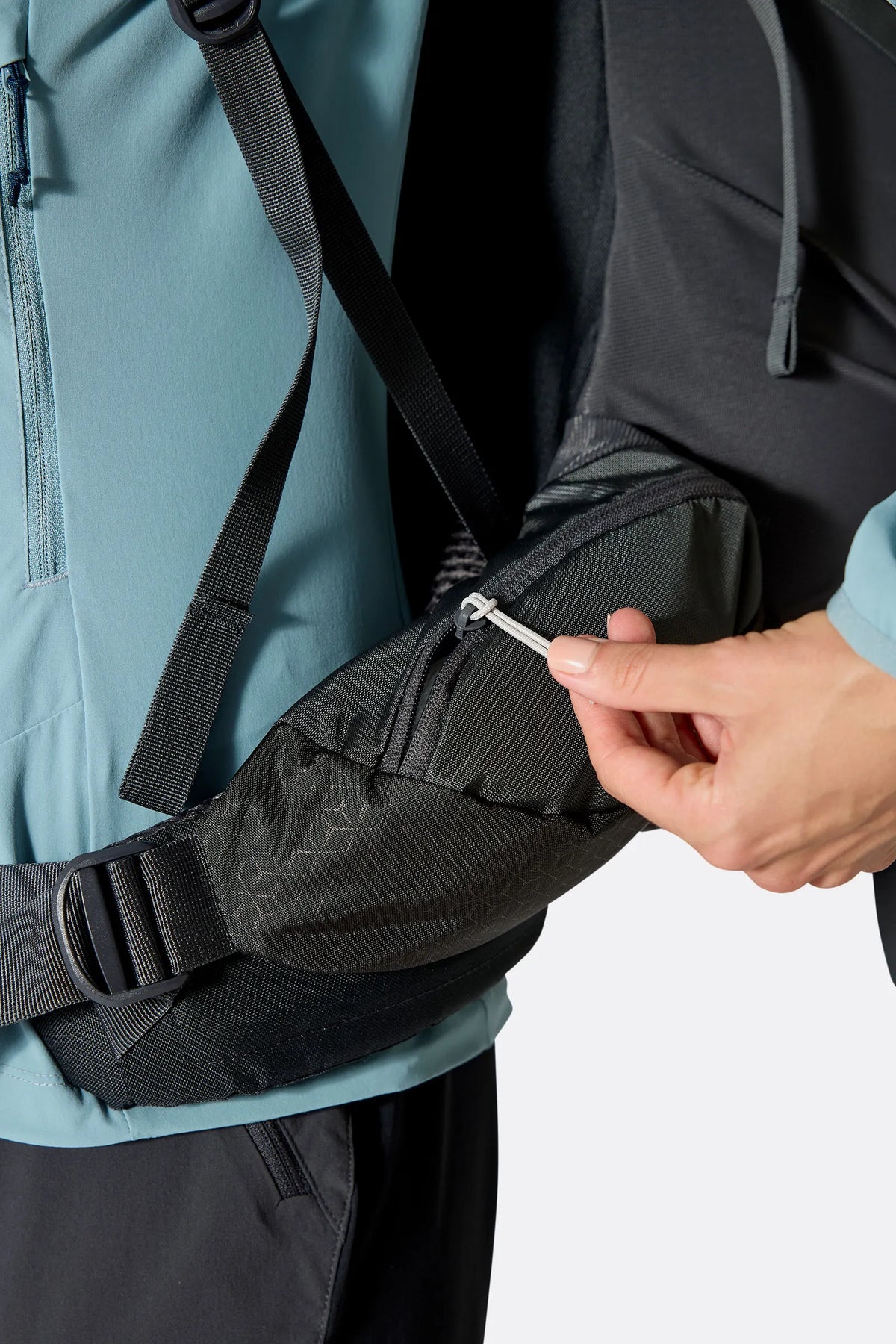The hipbelt is designed to securely fasten around your hips. A common mistake is to put the weight of the backpack on your shoulders and use the hip strap for stabilisation. In fact, it works the other way round. The hips need to take your weight and the shoulder straps are for stabilisation.