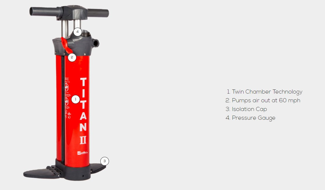 The Titan II Pump is the world's first purpose-built, double chamber SUP pump. It's designed to cut the amount of time and effort it takes to inflate your board by half. Constant innovation has led to us testing the absolute boundaries of inflation technology and as such, we're confident that there's nothing quite like the Titan II pump on the market.